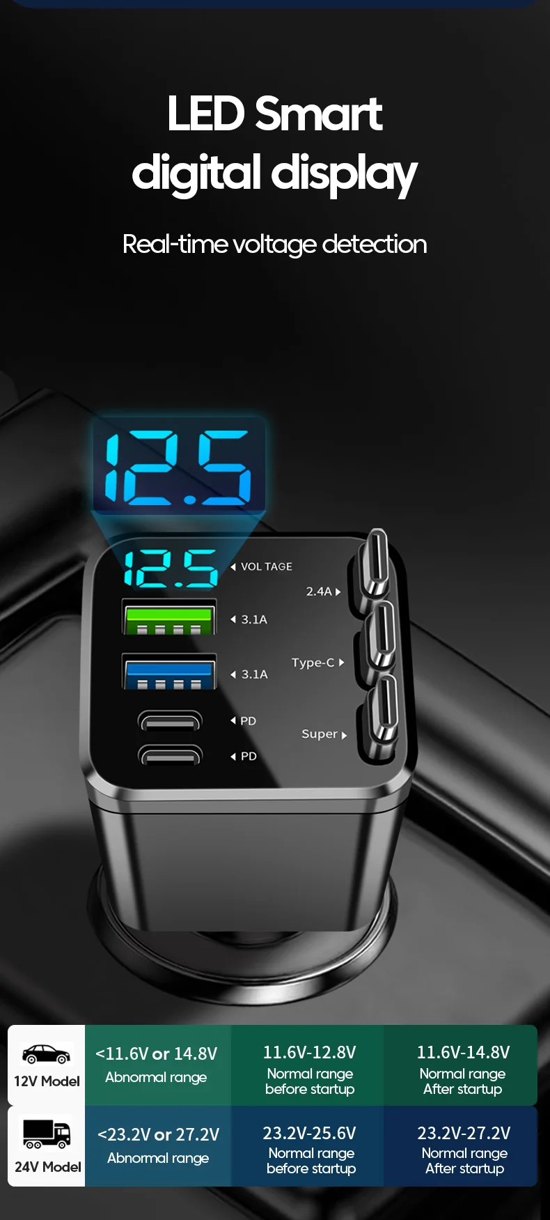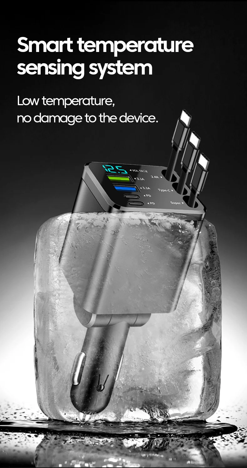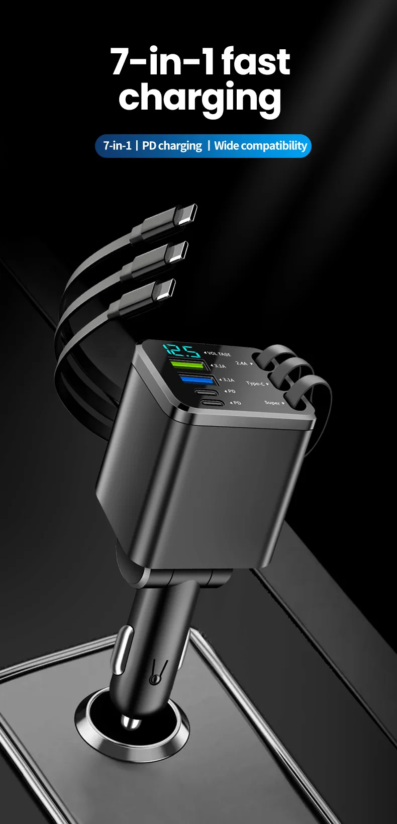 7-in-1 Retractable Car Charger Fast Charging USB Type-C Power Adapter With LED Retractable Cable for iPhone Xiaomi